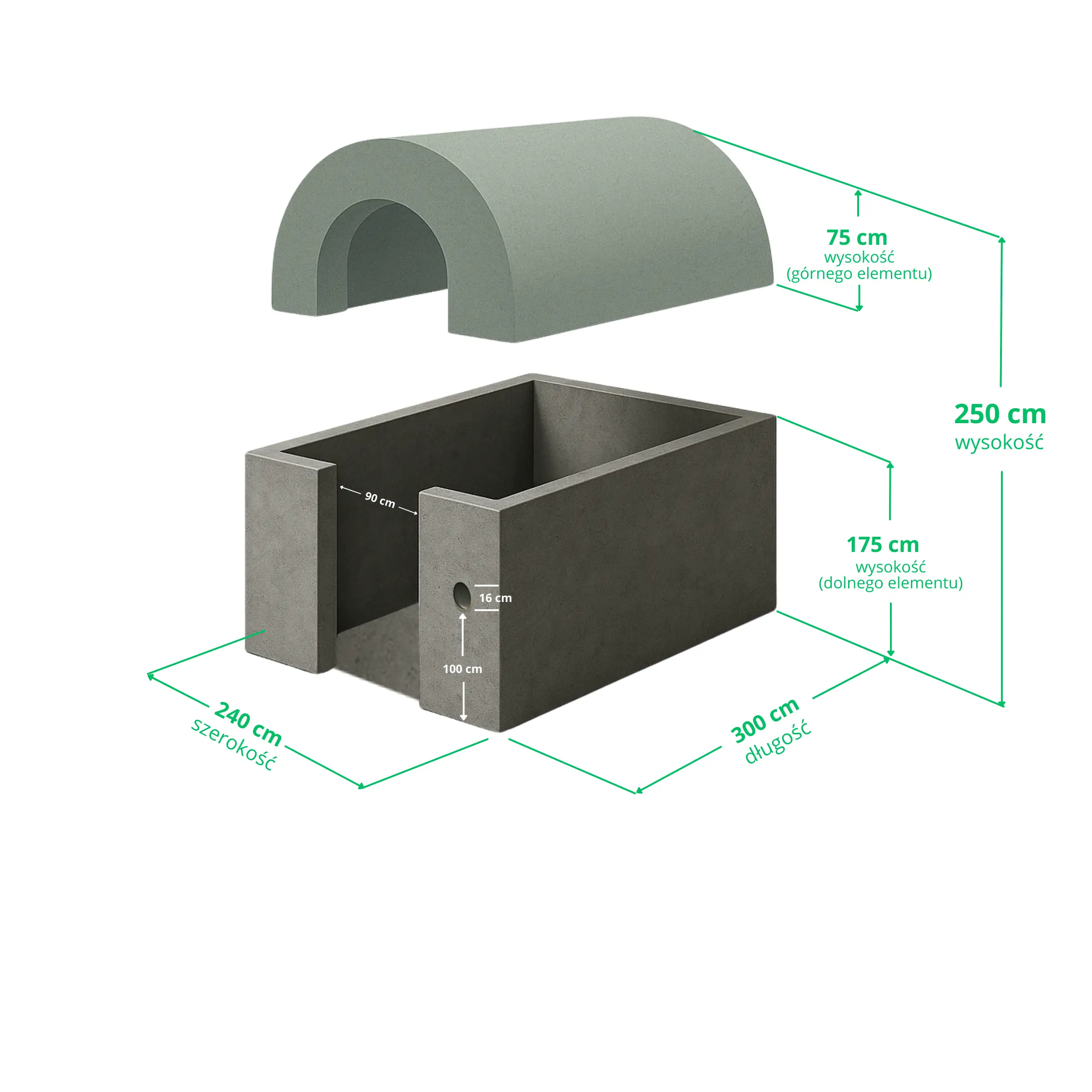 Piwnica betonowa z okrągłą kopułą MAXI od Eco Container to praktyczne i trwałe rozwiązanie dla Twojego ogrodu. Wykonana z betonu klasy C25/30 W8 zbrojonego stalą Fi6, Fi8, Fi10 oraz maty zbrojeniowe, zapewnia szczelność i odporność na warunki atmosferyczne. O wymiarach 300 cm x 240 cm x 250 cm, idealnie nadaje się do przechowywania przetworów, warzyw, wina czy sprzętów ogrodowych, bez konieczności budowy tradycyjnego wejścia z przedsionkiem.