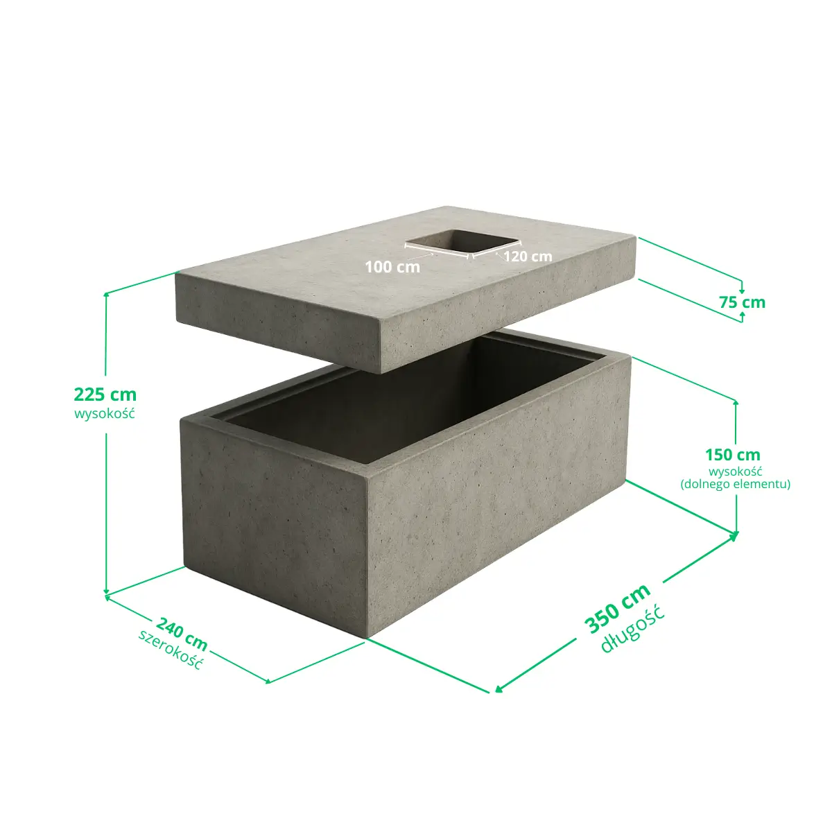 Piwnica betonowa z płaską kopułą i schodami bez szczytu od Eco Container to praktyczne i trwałe rozwiązanie dla Twojego ogrodu. Wykonana z betonu klasy C25/30 W8 zbrojonego stalą Fi6, Fi8, Fi10 oraz maty zbrojeniowe, zapewnia szczelność i odporność na warunki atmosferyczne. O wymiarach 350 cm x 240 cm x 225 cm (korpus 350 cm + kopuła 75 cm), z wygodnym wejściem od góry, idealnie nadaje się do przechowywania przetworów, warzyw, wina czy sprzętów ogrodowych.