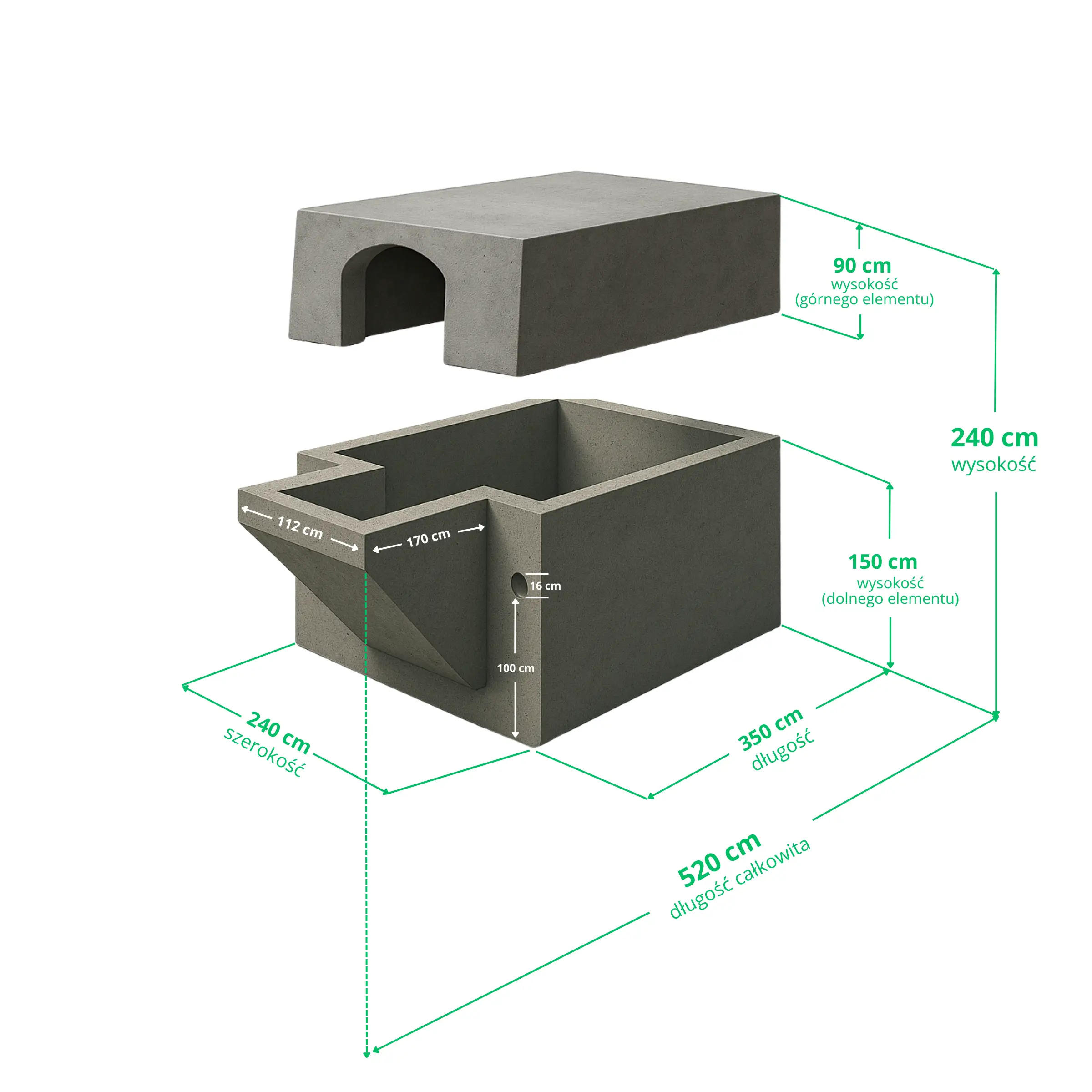 Piwnica betonowa z płaską kopułą i schodami bez szczytu od Eco Container to praktyczne i trwałe rozwiązanie dla Twojego ogrodu. Wykonana z betonu klasy C25/30 W8 zbrojonego stalą Fi6, Fi8, Fi10 oraz maty zbrojeniowe, zapewnia szczelność i odporność na warunki atmosferyczne. O wymiarach 520 cm x 240 cm x 240 cm (korpus 350 cm + wejście 170 cm), z wygodnym wejściem ze schodami, idealnie nadaje się do przechowywania przetworów, warzyw, wina czy sprzętów ogrodowych.